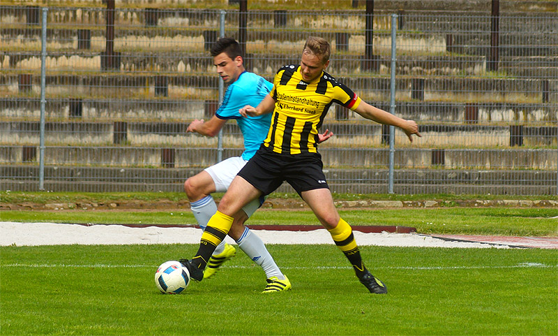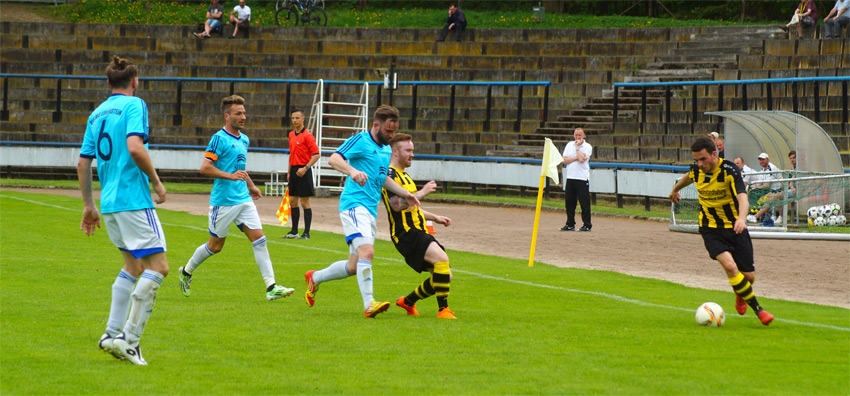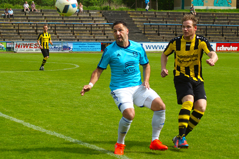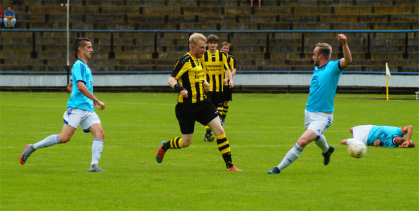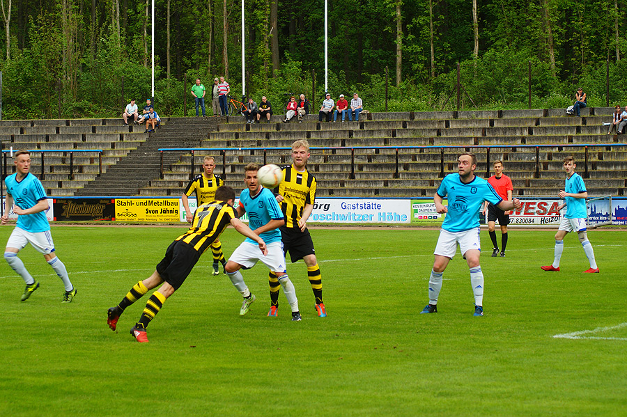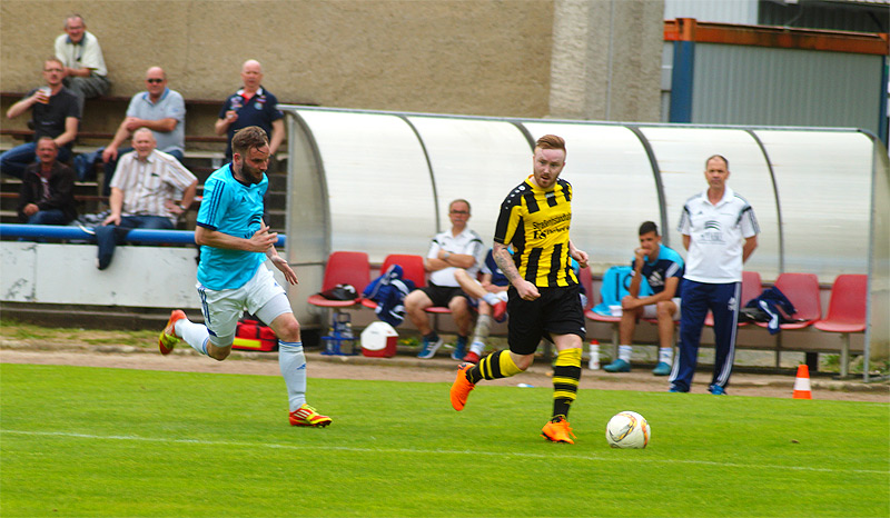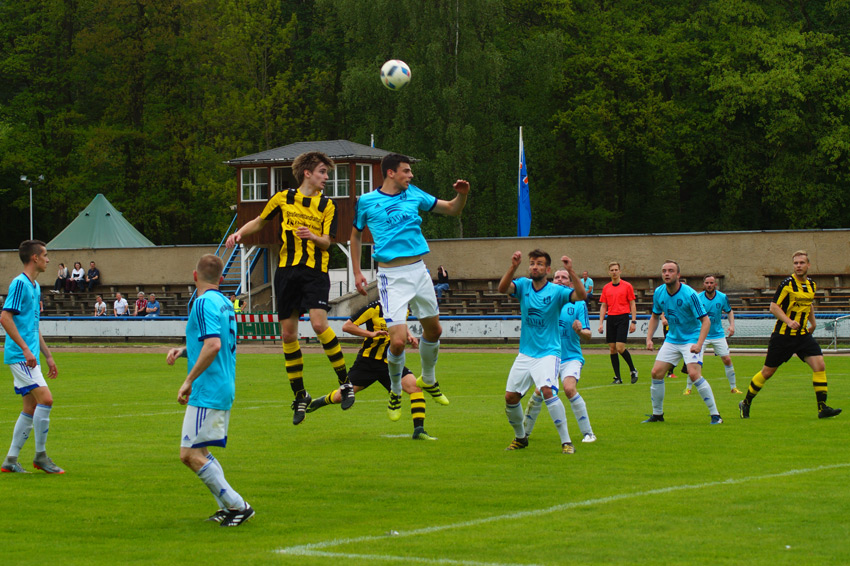 Was folgte war eine Leistung vom VfR Bad Lobenstein, die man als Landesklasse-Standard bezeichnen kann und eine Leistung der Gastgeber, die weit entfernt von der aus der Hinrunde war. Dass hier ein ehemaliger Landesligist und früherer Tabellenführer auf eine Mannschaft traf, die im Hinspiel mit 4:0 vom Platz gefegt wurde, war nur zu erahnen. Halbchancen gab es so nur selten, zum Beispiel nach einem scharfen Pass von Fabian Baur in die Spitze, wobei Torhüter Richie Steinbach vor Nick Oelsner am Ball war (19.). Direkt im Gegenzug bettelte man jedoch förmlich um das Gegentor, als man Oliver Hölzel im Strafraum zu viel Platz ließ, der mit einem Pass in den Fünfmeterraum seinen Kollegen Sebastian Mai mustergültig bediente, welcher die Kugel nur noch zum 0:1 ins Tor hämmern musste (20.).