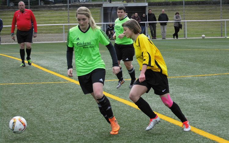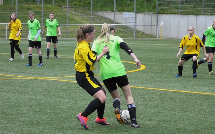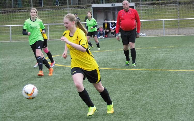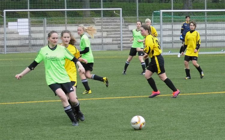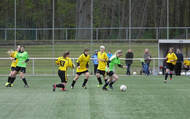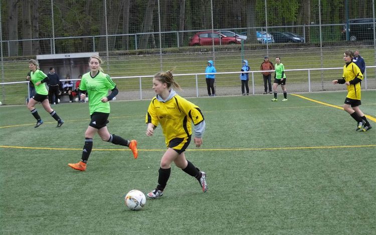 Schon nach wenigen Minuten hatte Magdala die erste große Chance, aber mit Karolin Heimer stand eine sehr sichere und aufmerksame Torfrau zwischen den Pfosten, die diese brenzlige Situation souverän klären konnte. Auch im weiteren Spielverlauf strahlte sie eine große Ruhe und Übersicht aus, so dass sich ihre Vorderleute ab und zu auch mal einen kleinen Abwehrschnitzer leisten konnten, den sie aber stets ausbügeln konnte. Motor versuchte den Gegner aber meist durch eine geordnete Defensivleistung vom eigenen Tor fernzuhalten. Mit viel Laufarbeit wurden für die schnellen Gästestürmerinnen die Räume sehr eng gemacht. Susann Wutschel und Claudia Heinz organisierten mit ihrer Erfahrung die Defensive und die jungen Mädels, Lena Berger, Seline Andla, Jasmin Bauch und Nora Kubik hielten im Abwehrverbund mit Zweikampfstärke dagegen, wie auch der Gäste-Co-Trainer nach dem Spiel anmerkte: „Man hat gesehen, dass diese jungen Spielerinnen in Nachwuchs-Jungs-Mannschaften spielen. Die haben keine Angst und sind sehr zweikampfstark.“ Trainer Holger Kubik bot im Mittelfeld mit Annika Schmalz, Vanessa Beck und Jenny Richter eine Achse auf, die auch spielerisch immer wieder Akzente setzten konnte. Im Sturm ging Annabella Tänzler unglaublich viele Wege, so dass sich immer wieder Lücken zum Nachrücken aus dem Mittelfeld ergaben, was Motor jedoch zu selten nutzte. Man wollte sich nicht zu sehr aus der Defensive locken lassen, hatte man den Eindruck. Das Geschehen spielte sich somit in den ersten Minuten fast nur im Mittelfeld ab. Torchancen blieben Mangelware. Wie aus dem Nichts ging Magdala nach 17 Minuten, allerdings aus stark abseitsverdächtiger Position, durch Annika Etzrodt in Führung. Den ersten Schuss konnte Karolin Heimer noch parieren, aber den Nachschuss bekam sie doch nicht mehr zu fassen. Die Schwarz-Gelben ließen sich davon jedoch nicht beeindrucken und trauten sich nun mehr nach vorn. Als sich die agile Jenny Richter auf der rechten Außenbahn entscheidend durchsetzen konnte und entschlossen den Ball nach innen brachte, brannte es erstmals lichterloh vor dem Tor Gäste. Irgendwie bekamen sie das Leder aus der Gefahrenzone dann wieder heraus, direkt zu Annika Schmalz, die sich ein Herz fasste und einfach mal abzog. Mit Hilfe von Katharina Stock im Gästetor, die den Ball erst hinter der Torlinie zu fassen bekam, war der Ausgleich geschafft (36.). Kurze Zeit später pfiff Schiedsrichter Marco Steinicke zur Pause und die Schwarz-Gelben gingen mit viel Selbstvertrauen in die Kabine.