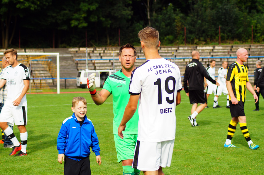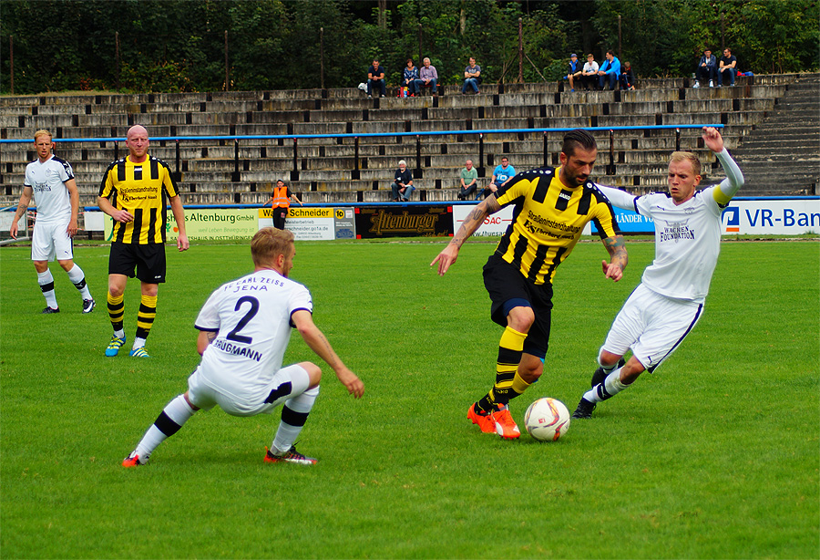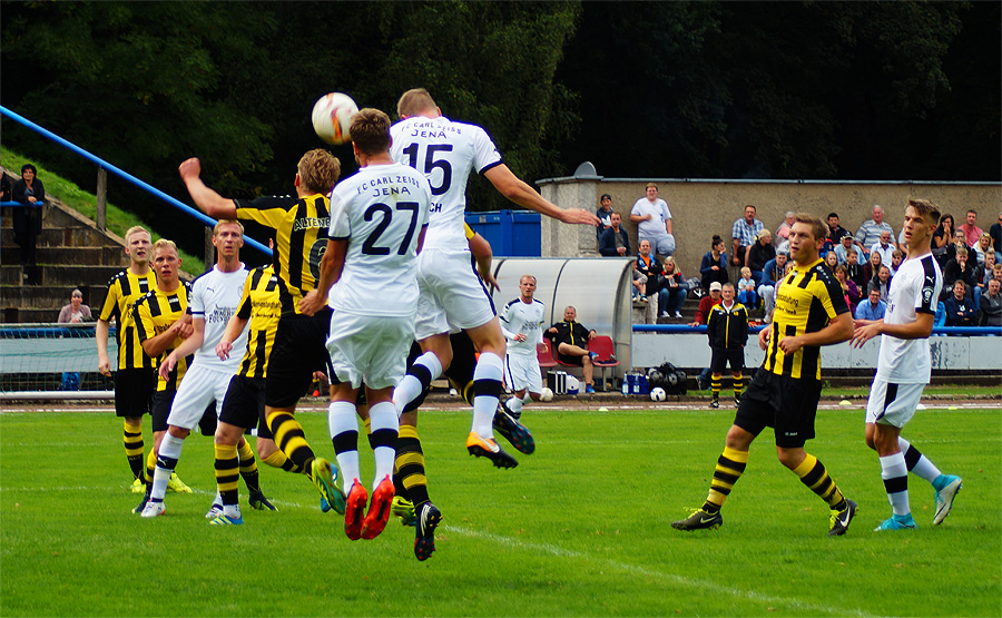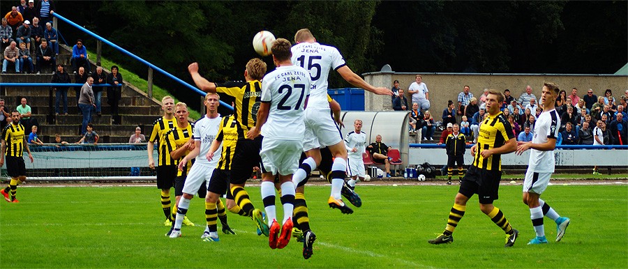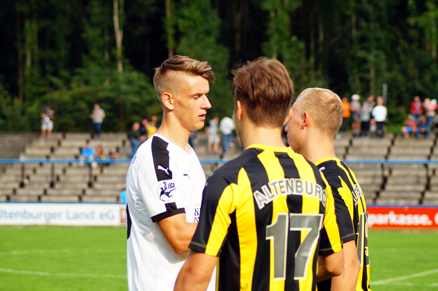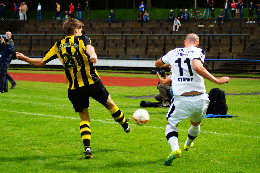 Zu knabbern hatten die Jenaer auch mit Torhüter Norman Teichmann, der immer ein gutes Auge für den Ball hatte und klare Torchancen entschärfte. So auch in der 11. Minute, als Brügmann den Heber in die Spitze zu Julian Günther-Schmidt brachte, der mit seinem Kopfball den Altenburger Torhüter jedoch nicht überwinden konnte. Viele Eckbälle hatte Jena auf dem Konto, diese brachten schließlich jedoch wenig ein und wurden meist von Abwehr oder Torhüter geklärt.