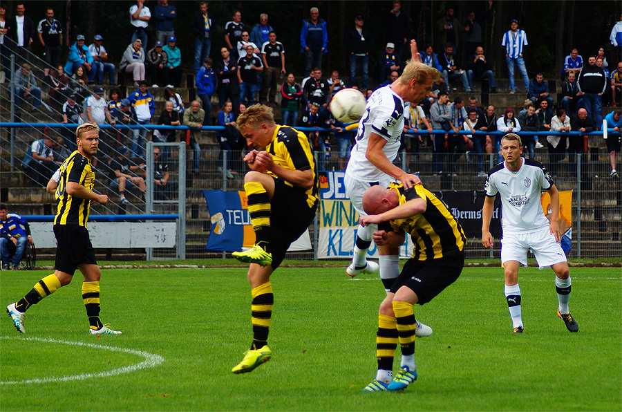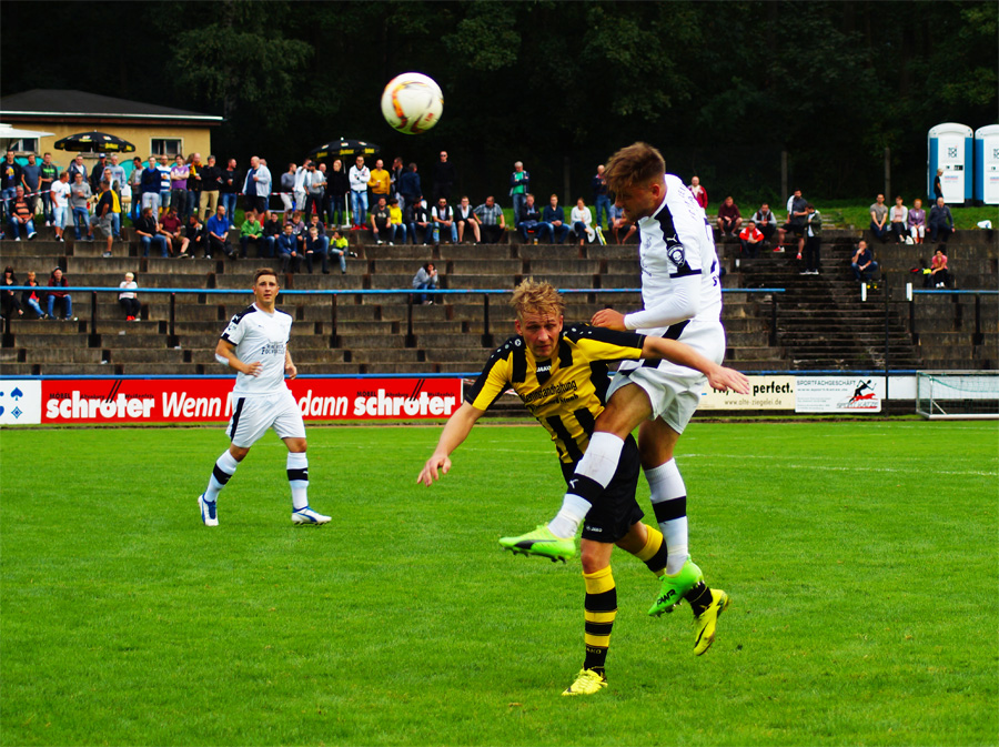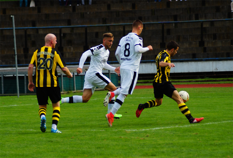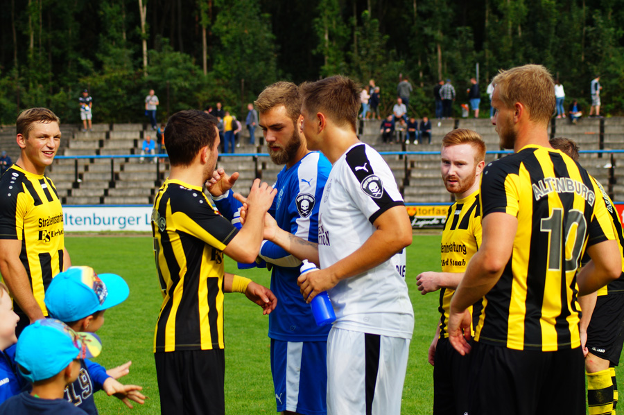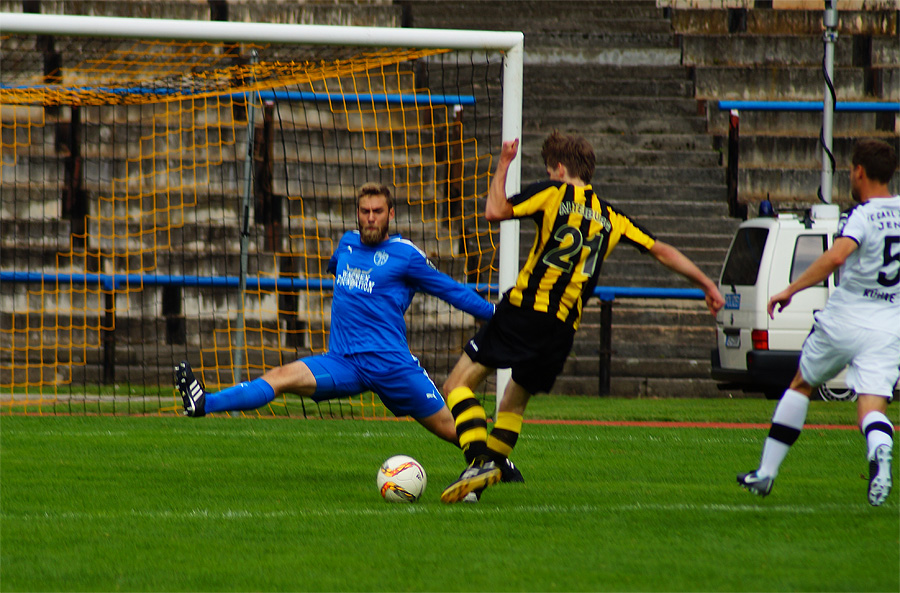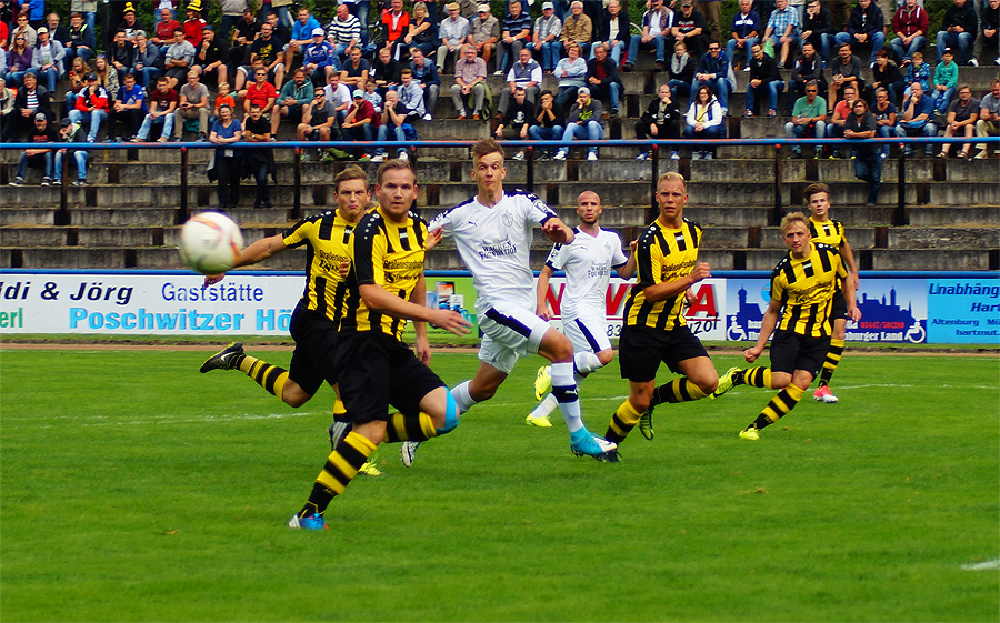 Zu knabbern hatten die Jenaer auch mit Torhüter Norman Teichmann, der immer ein gutes Auge für den Ball hatte und klare Torchancen entschärfte. So auch in der 11. Minute, als Brügmann den Heber in die Spitze zu Julian Günther-Schmidt brachte, der mit seinem Kopfball den Altenburger Torhüter jedoch nicht überwinden konnte. Viele Eckbälle hatte Jena auf dem Konto, diese brachten schließlich jedoch wenig ein und wurden meist von Abwehr oder Torhüter geklärt.