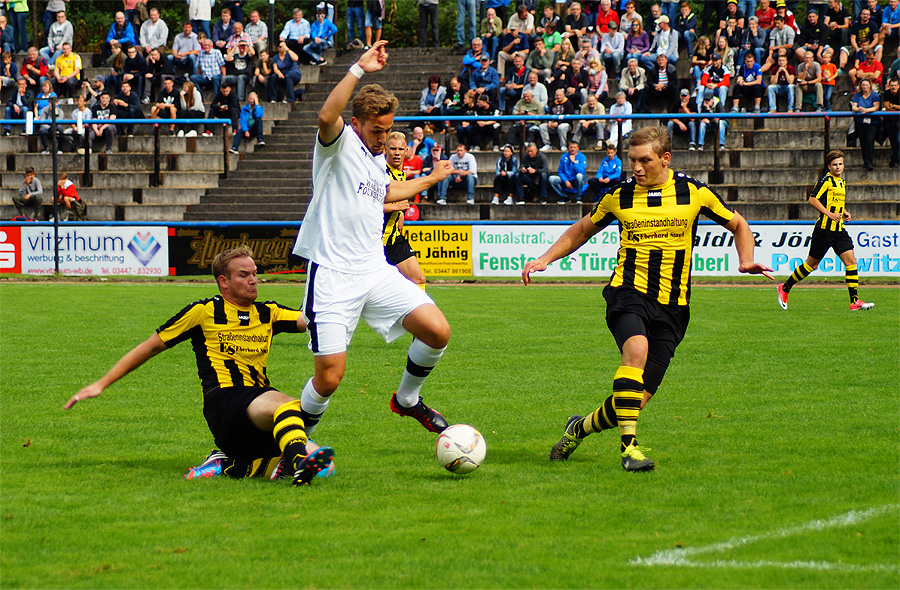 Vor der Halbzeit ließen die Gäste Motor zu sehr kommen, die eindeutigen Torchancen nahmen ab, während sich das Spiel etwas vom Altenburger Strafraum entfernte. In der 44. Minute stieß Florian Brügmann im Strafraum mit Silvio Ollert zusammen, plötzlich entschied Schiedsrichter Michael Wilske auf Elfmeter, den Manfred Starke verwandelte. Fragwürdig, aber am Ende war eine Gästeführung zur Halbzeit aufgrund der Masse an Chancen verdient.