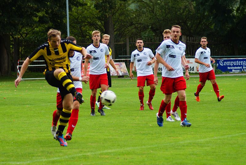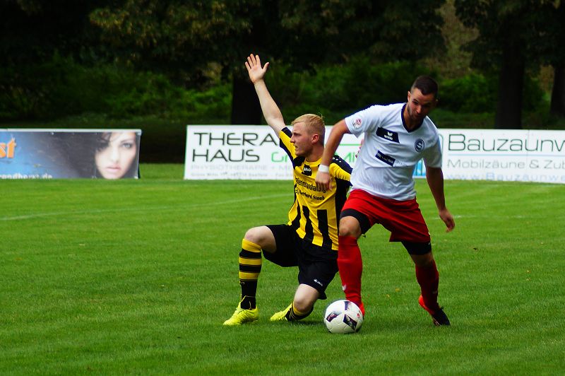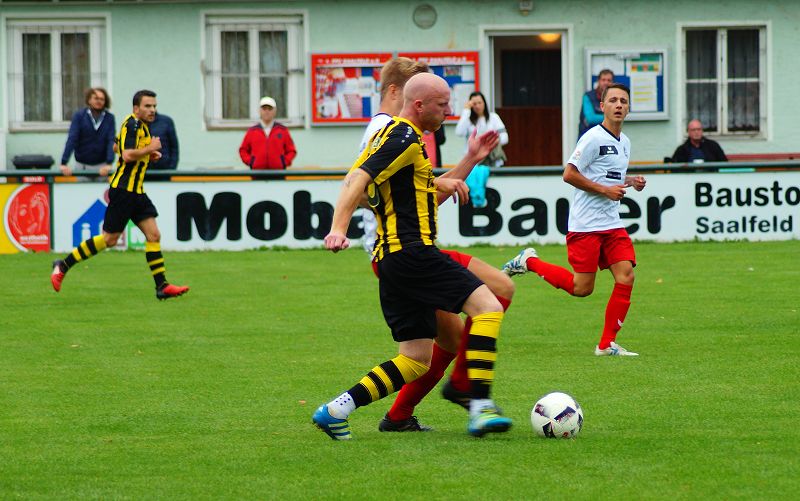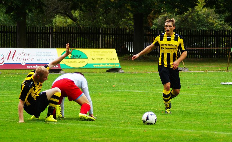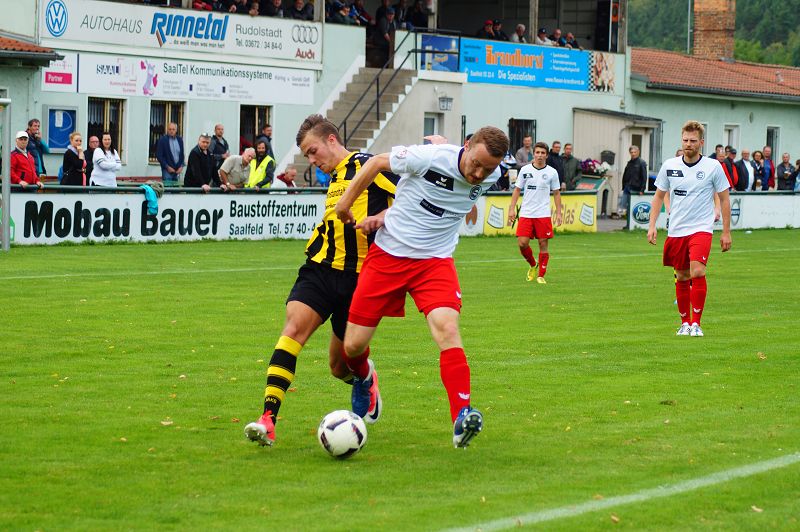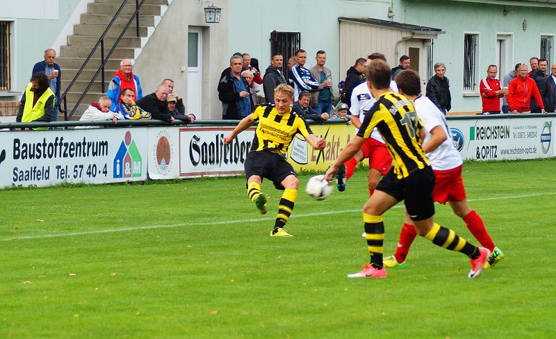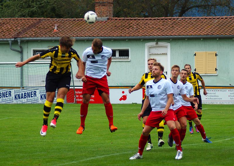 Motor hatte diesmal weniger Ideen im Angriff, die erste Torchance in der 13. Minute ging trotzdem auf das Altenburger Konto. Fabian Baur steckte den Ball zu Rico Heuschkel durch, der an der Grundlinie Nick Oelsner in der Mitte suchte, wobei ihm der Treffer verwehrt blieb. Glück für Saalfeld. In der 22. Minute schoss Nick Oelsner noch einmal über das Tor, ansonsten fehlte bei beiden Mannschaften stets der letzte Pass, sodass sich das Spiel zwischen den Strafräumen abspielte und langsam aber sicher zu einem echten Kraftakt wurde. Doch Saalfeld sollte am Ende der ersten Hälfte noch brandgefährlich werden, nachdem man schon nach einem Schuss von Bartosz Latuszek in der 30. Minute eine gute Chance hatte, wobei Norman Teichmann im zweiten Versuch abwehren konnte und Ken Langhammer dann weit drüberschoss. So befand sich Felix Weber in der 41. Minute im Duell mit Kai Müller, wobei sich der Motor-Verteidiger durchsetzen konnte, bevor es ernst wurde. Kurz darauf wurde es wieder brenzlig, doch bei einem Pass in den Fünfmeterraum kam Saalfeld nicht mehr an den Ball heran.