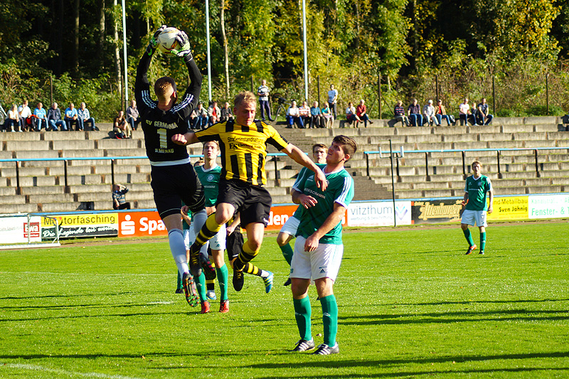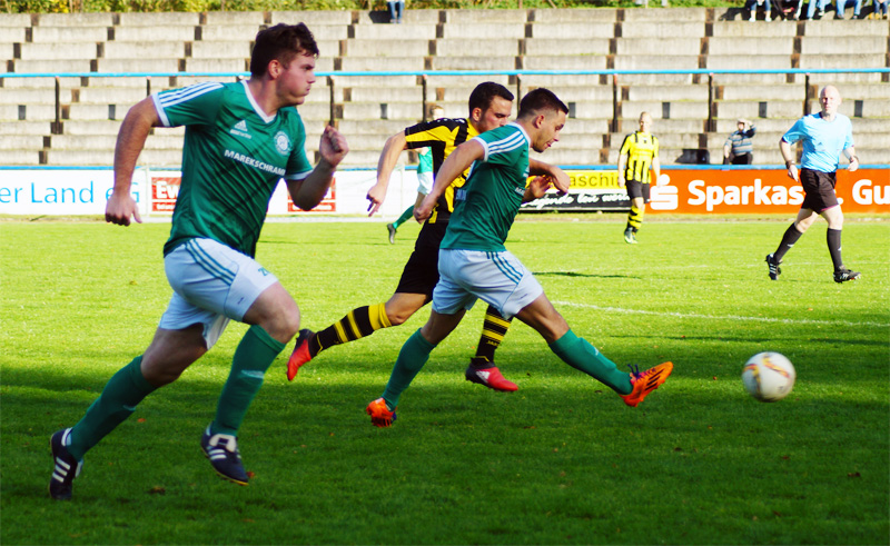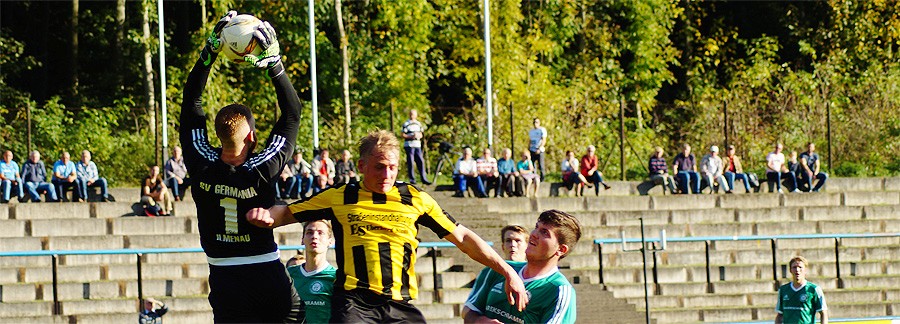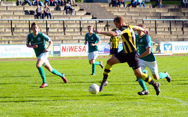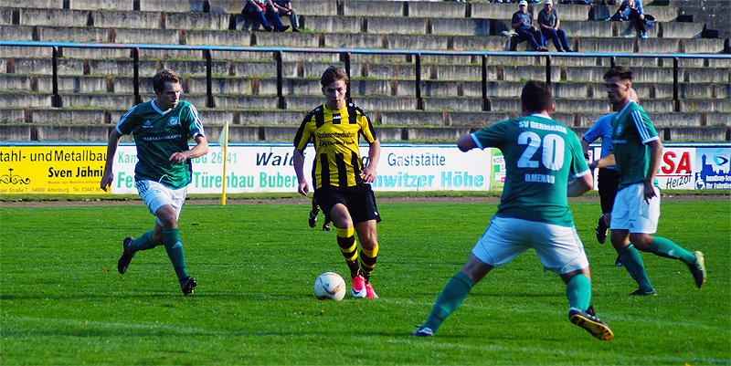 Motor ging dennoch wie aus dem Nichts per Standard in Führung. In der 28. Minute trat Motor zum Freistoß nahe der Strafraumgrenze an. Rico Heuschkel überraschte Mauer und Torhüter und traf damit zur unerwarteten 1:0 Führung. Nun drehten die Jungs von Germania Ilmenau jedoch auf und zeigten allmählich, dass sie an diesem Tag die bessere Mannschaft sein sollten. In der 33. Minute hebelten die Gäste die Motor-Abwehr aus, sodass Matthias Wolfenstetter frei vor dem Tor nur noch einschieben musste. Kurz vor der Halbzeit schoss Kevin Ewald den Ball noch einmal links am Tor vorbei, dann ging es zurück in die Kabinen.
