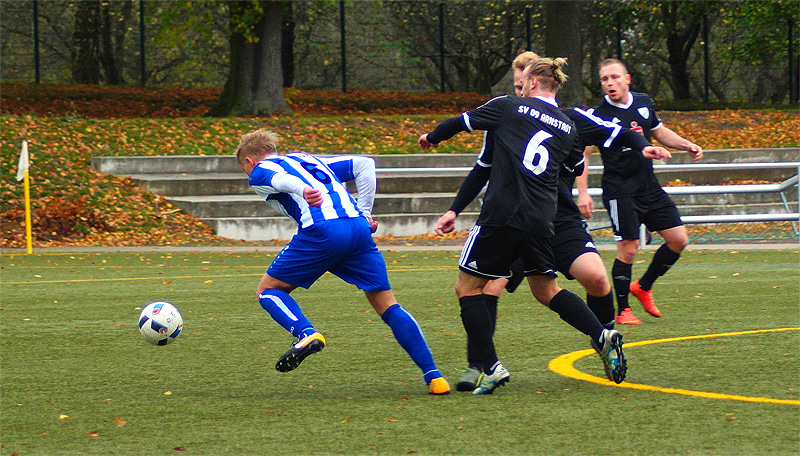 Motor ließ sich davon jedoch nicht abschrecken und profitierte davon, dass ausnahmslos jeder Spieler an diesem Tag eine starke Leistung zeigte. Insbesondere Alexander Korent wuchs über sich hinaus und spielte seine Gegner schwindlig. Nach dem verschossenen Elfmeter kam Arnstadt besser ins Spiel, Gefahr konnte man jedoch nicht ausstrahlen. Vor allem bei den zweiten Bällen sahen die Gäste nicht gut aus, was auf einem engen Platz wie dem Kunstrasen schnell brandgefährlich wird. Die beste Chance hatte Arnstadt in der 25. Minute per Freistoß aus 20 Metern, den Jacob Mühlmann jedoch mit einer Hand über die Latte lenken konnte.