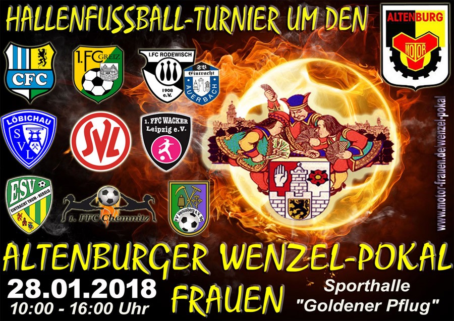 Am Sonntag, den 28.01.2018, ab 10:00 Uhr rollt nun der Ball beim 2. Wenzel-Pokal im „Goldenen Pflug“. Im Vorjahr lieferten das damals, noch in der Gründungsphase befindliche Team eine sensationelle Leistung ab. Nur das Auftaktspiel ging gegen den SV Hof verloren. Ein Tor fehlte nach der Vorrunde am Einzug ins Halbfinale und um Platz 5 gab es dann ein dramatisches Neunmeterschießen gegen den ZFC. Alle Zuschauer waren von der Qualität des Turniers begeistert.
