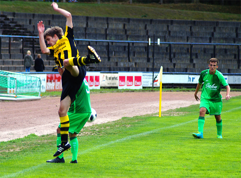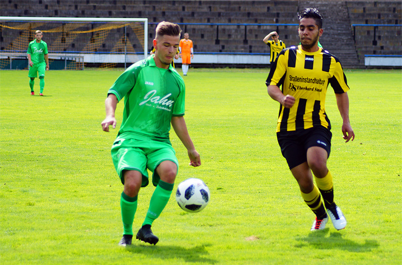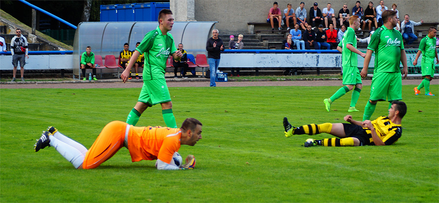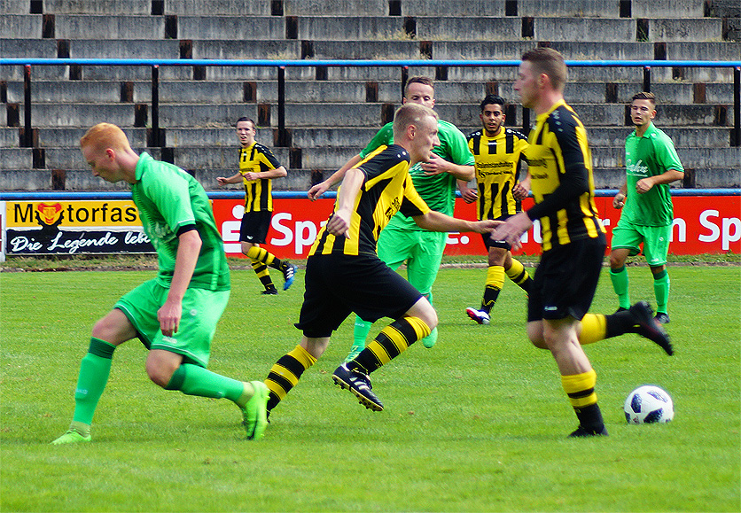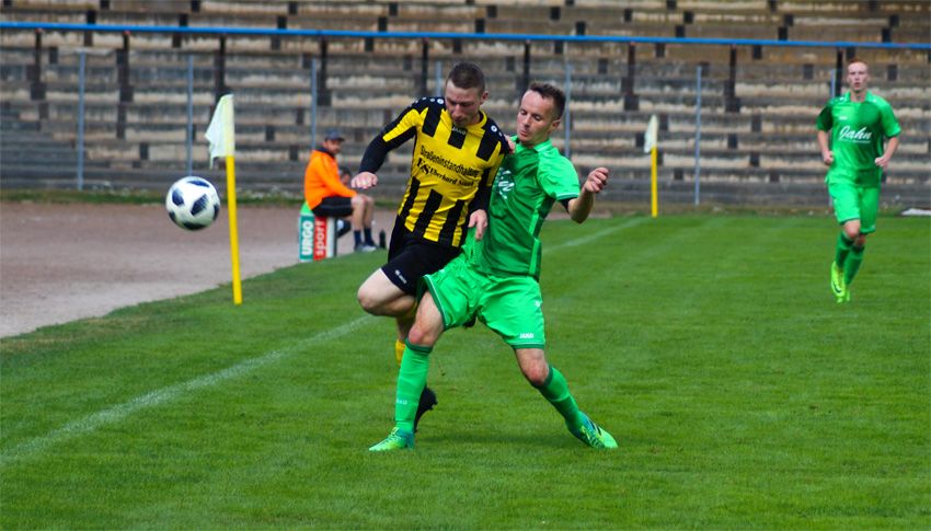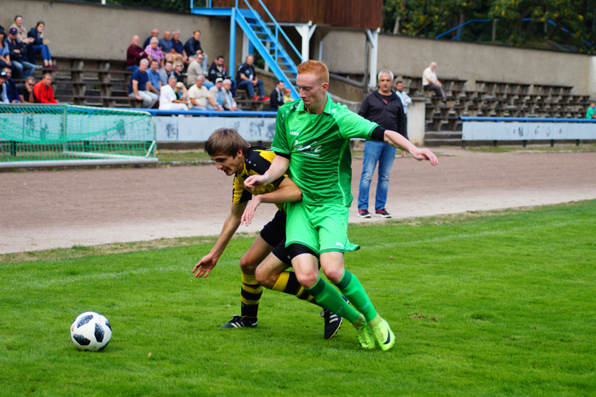 Motor begann damit, den Ball ruhig durch die eigenen Reihen laufen zu lassen. Dabei stimmte die Harmonie in der Mannschaft direkt. Motor war in der ersten Hälfte einen Tick wacher als die Gäste aus der Kreisoberliga und konnte den Spielaufbau der Greizer schnell stören und wichtige Bälle erobern. Ein erstes Achtungszeichen setzte Motor kurz nach dem Beginn, als Fabian Baur den Ball nach einem Freistoß von Philipp Prechtl per Direktabnahme auf das Tor hämmerte (3.). Ein starkes Spiel zeigte auch Torhüter Norman Schote, der die Greizer bei ihren wenigen Torchancen zum Verzweifeln brachte. Nachdem er weit vor dem Tor postiert war, entschärfte er einen langen Ball noch mit einer beispiellosen Rettungstat (6.). Auch bei Toni Kreidemeiers Versuch aus der Drehung war er direkt zur Stelle (14.). Ein Klassenunterschied war in der ersten Hälfte kaum zu erkennen. Die Greizer schafften es nur selten, ihre individuelle Klasse abzurufen und scheiterten meist in Laufduellen mit der Altenburger Fünferkette. Zwar beschränkte sich Motor zunächst aufs Kontern, wurde da jedoch auch das eine oder andere Mal gefährlich. So war es zum Beispiel beim Seitfallzieher von Maik Gordziel der Fall (24.).