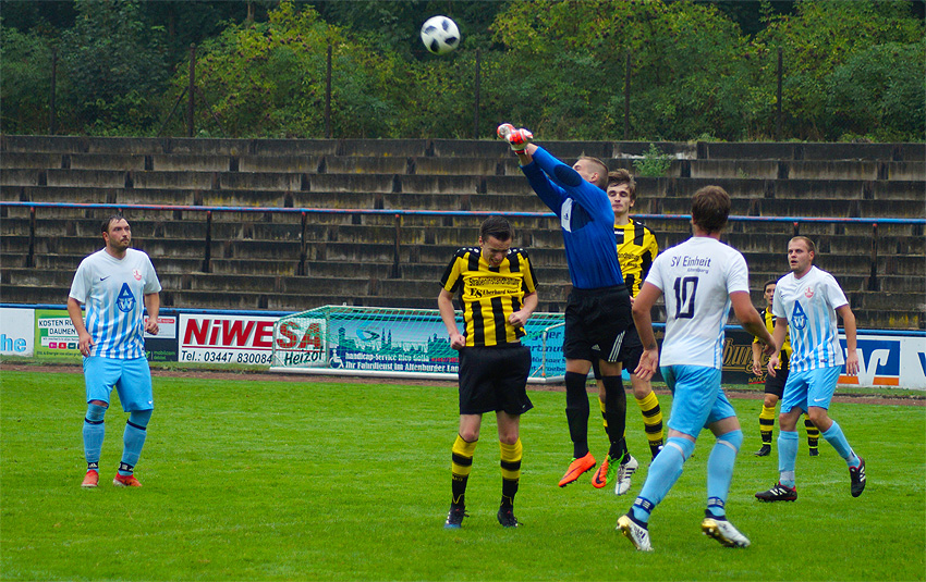 Der SV Motor Altenburg war die wachere und eingespieltere Mannschaft. Dies machte sich schon nach wenigen Minuten bemerkbar, als ein Missverständnis zwischen dem Torwart der Gäste und dessen Abwehrspieler entstand, Stürmer Maik Gordziel direkt zur Stelle war und den Ball nur noch zum 1:0 ins Tor schieben musste (5.). Die Gastgeber waren nun am Zug und hatten durch mehrere Freistöße gute Gelegenheiten, jedoch gingen diese alle knapp über das Tor. Den Schock aus dem frühen Gegentor konnte Einheit nicht abschütteln und hatte vor allem mit der Sprintstärke einiger Spieler des SV Motor Probleme. So konnte der Gegenspieler von Abel Cristu ihm nur bei seiner mustergültigen Flanke auf Maik Gordziel zusehen, der am langen Pfosten bereitstand und auf 2:0 erhöhte (19.). Nach einer halben Stunde war Motor kurz vor der Vorentscheidung, jedoch schloss Maik Gordziel nach einem Abstimmungsproblem mit Steve Senff im Sechzehner überhastet ab und verlieh so seinem Schuss nicht die nötige Präzision (33.). Nach zwei Pflichtspielen können jedoch noch nicht alle Abläufe genau passen. Später konnte sich Tom Stange im Einheit-Tor auszeichnen, als er einen Freistoß von Fabian Baur aus 25 Metern entschärfte (37.).