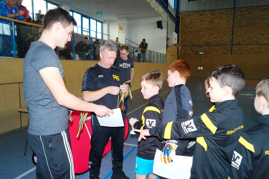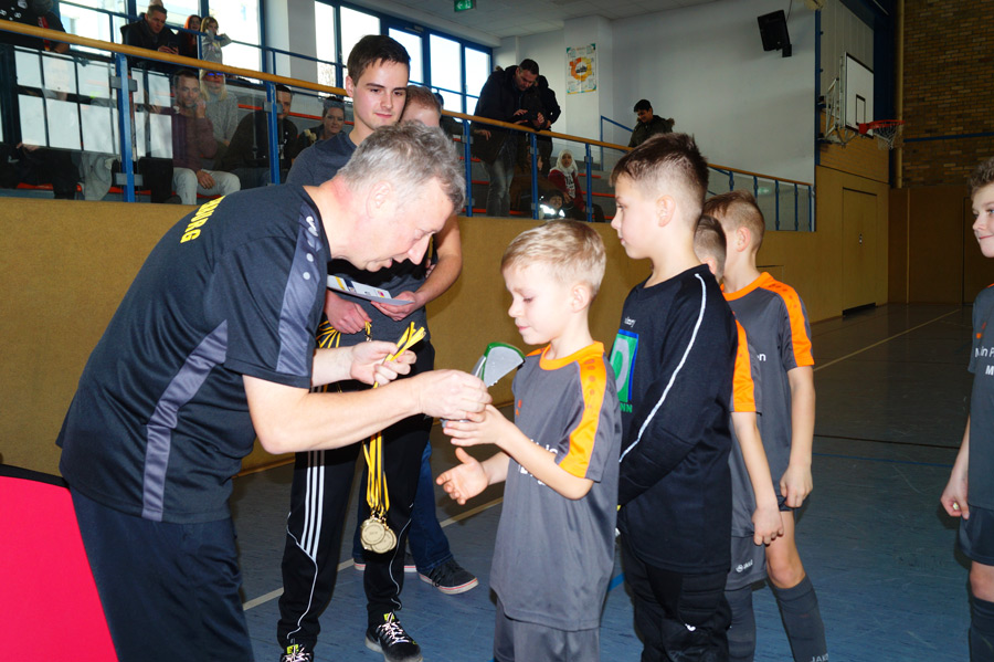 Neben den drei Pokalen für die Mannschaften, die auf dem Treppchen landeten sowie den Urkunden und Medaillen für alle Teams wurden auch die Einzelauszeichnungen verliehen. Auch nach dem letzten Spiel war das Rennen um den Preis für den besten Torschützen noch nicht entschieden, weshalb drei Spieler noch einmal im Neunmeterschießen antreten mussten. Hier war eine Entscheidung dann schnell gefallen: Paul Kluge vom TSV IFA Chemnitz sicherte sich mit vier Treffern und der nötigen Zielsicherheit im Stechen die Urkunde. Gleichzeitig wurde sein Mannschaftskamerad Nino Scherm zum besten Spieler des Turniers gewählt. Bester Torhüter wurde Anton Feldmann vom BSC Freiberg.