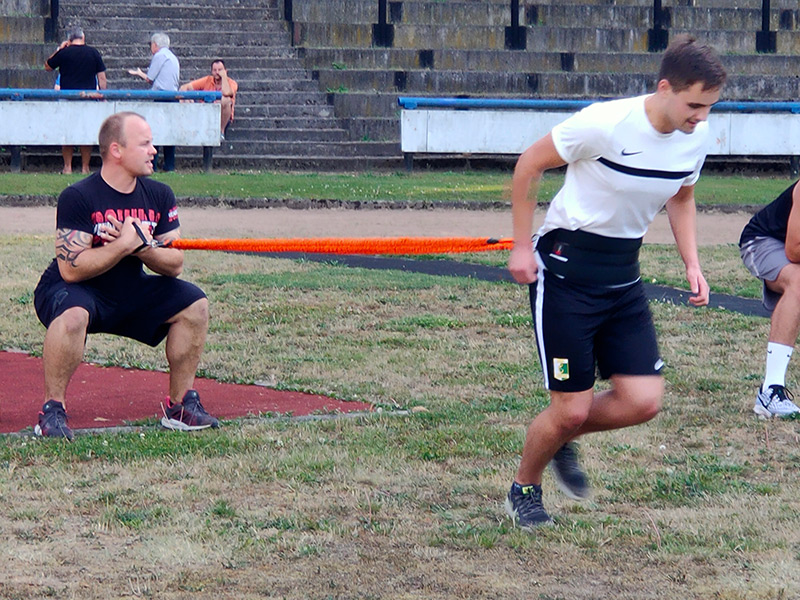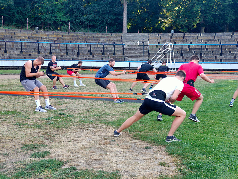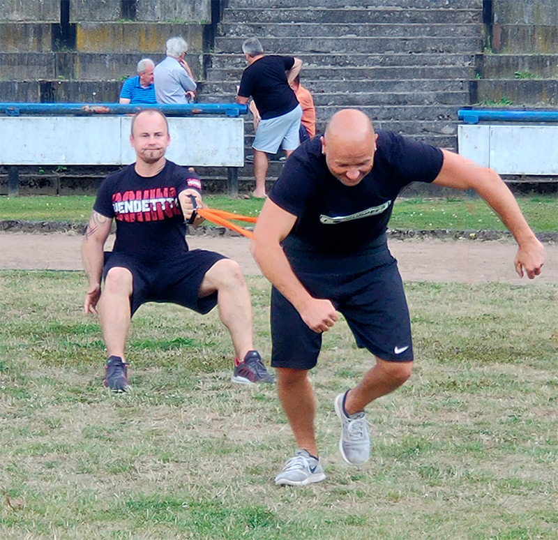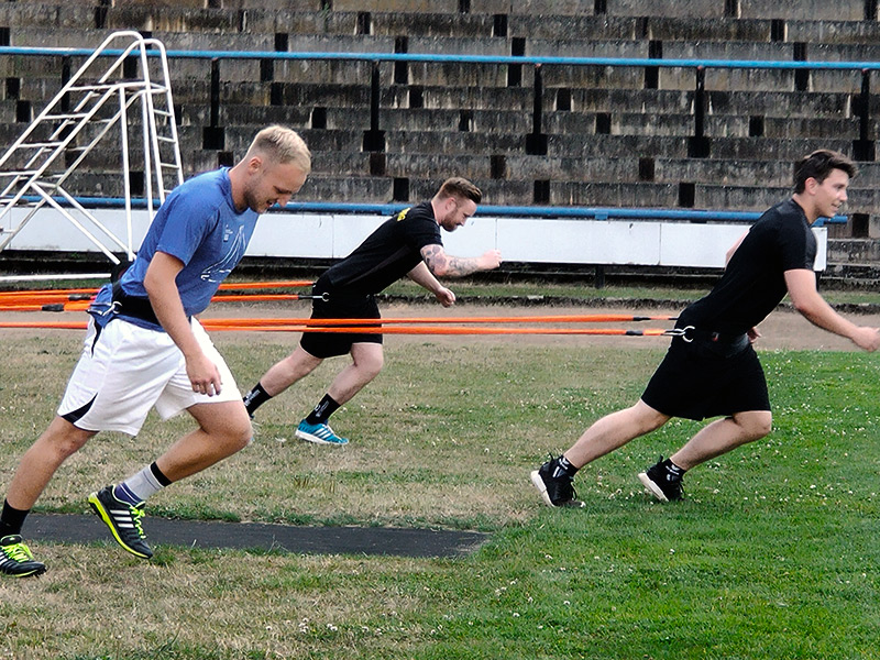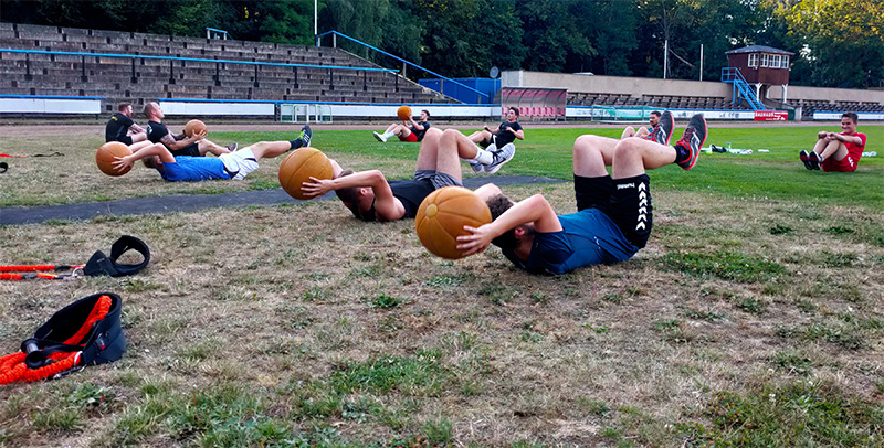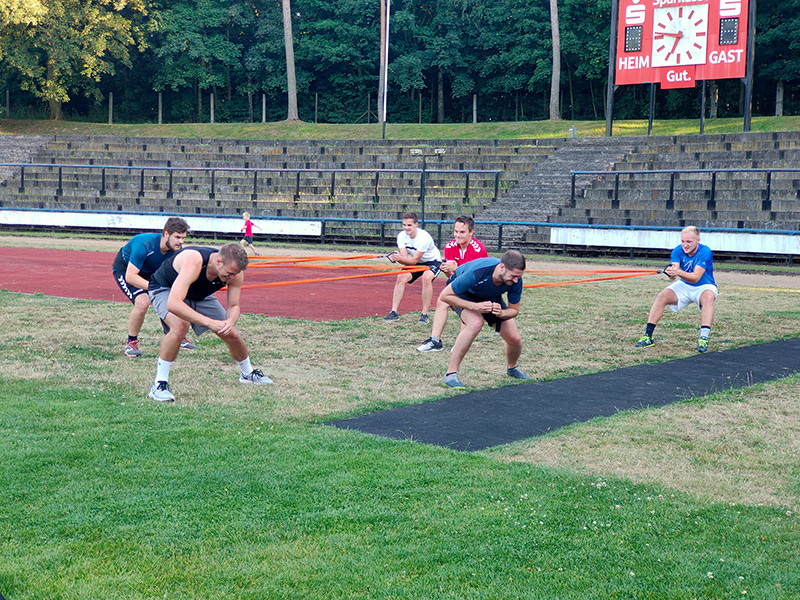 Coach Hübner hatte für seine Jungs eine Sondereinheit eingebaut, die es wirklich in sich hatte – die Fußbälle blieben diesmal in der Kabine. Unter fachmännischer Anleitung durchlief die Mannschaft ein sprichwörtlich atemberaubendes Krafttraining. Ziel der Übungen war es, neben der Ansteuerung der Muskulatur vor der Belastung, also dem Aufwärmen, vor allem die Kräftigung und Dehnung der Muskulatur. Dabei gingen die Jungs an ihre Grenzen, hatten in den 90 Minuten Intensivtraining aber auch viel Spaß.