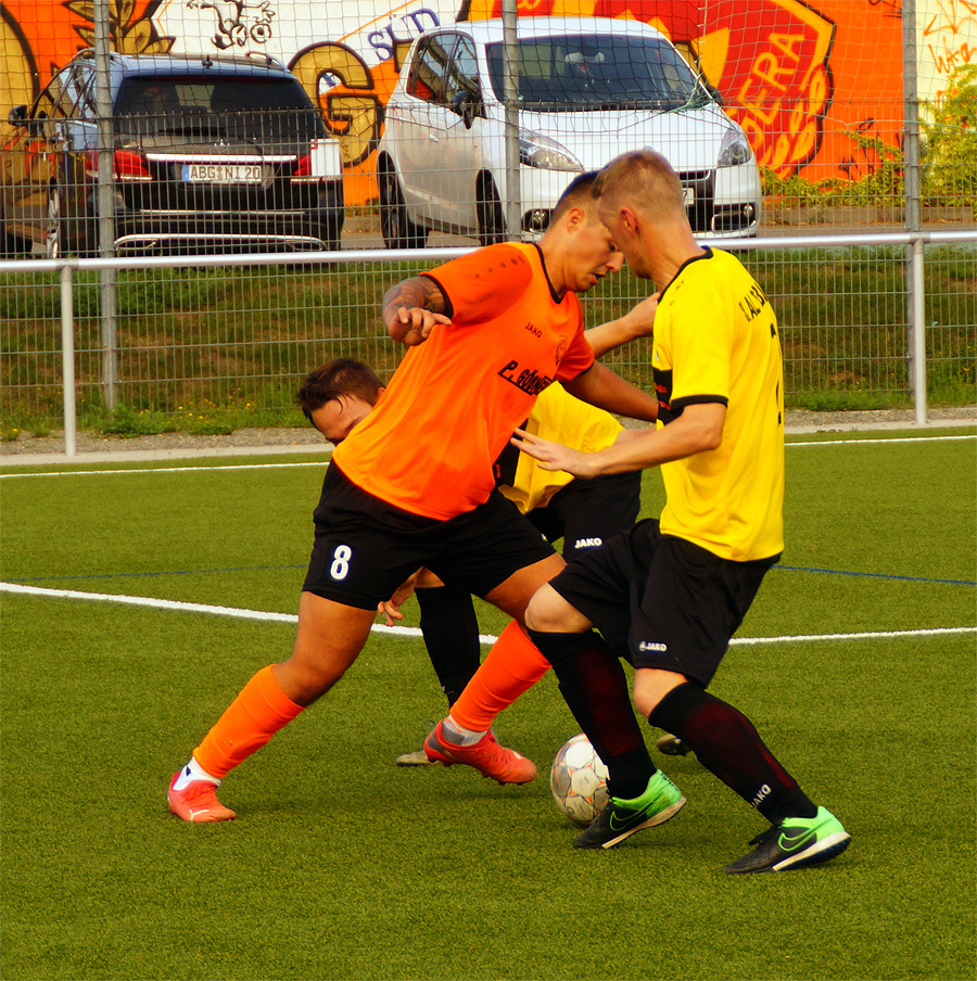 Wer dachte das Spiel sei nun gelaufen, sah sich getäuscht. Der Schiri zeigte gerade die drei Minuten Nachspielzeit an, da klatschte ein kurioser Freistoß von L. Gräbner an die Unterlatte und sprang unglücklich von Meißners Hacke ins Tor. Nur noch 3:2. Jetzt wurde es am und auf dem Platz nochmal hektisch. Ein Nachtreten von Geras H. Alsaneea gegen A. Al Saka kommentierte der bereits mit Gelb belastete N. Fahlbusch lautstark und sah dafür die gelb-rote Karte. Doch Motor behielt Unterzahl die Nerven, allen voran A. Korent, der allen Gegenspielern noch einmal davon rannte und in der zweiten Nachspielminute eiskalt zum 4:2 vollendete.