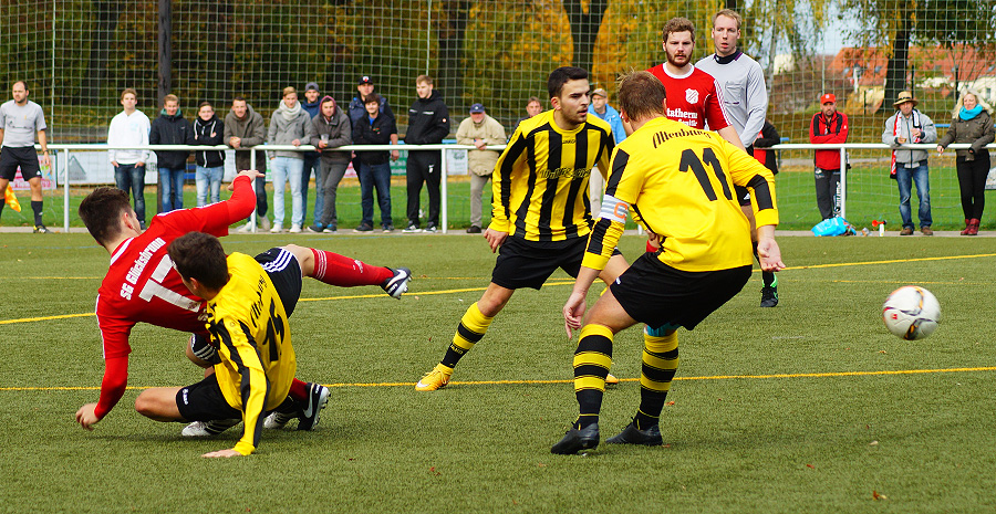 Es sollte ein Spiel der beiden Offensivabteilungen werden, wobei die Gäste von der SG Glücksbrunn Schweina an diesem Nachmittag sogar ganz ohne Tore des Toptorschützen Patrick Schellenberg auskamen. Bereits 20 Sekunden nach Anpfiff hatte Motor durch R. Heuschkel die Chance zur Führung als er allein vor Keeper Kallenbach auftauche, den Ball aber nicht an ihm vorbei brachte. Nach einem kurzen Abtasten zwischen beiden Mannschaften wurde es dann aber im Altenburger Strafraum schon brandgefährlich. In der 12. Spielminute konnte Norman Teichmann einen Schuss aus Nahdistanz noch gekonnt entschärfen, wenig später klingelte es jedoch, als Kevin Grob frei vor dem Tor auftauchte und aus wenigen Metern einschob. Dem Schweinaer Angriff vorausgegangen war aber ein Foulspiel an D. Weiße nahe der Seitenlinie direkt vor den Augen des Linienrichters, der dieses jedoch ignorierte. Direkt nach dem Wiederanpfiff nutzte Motor jedoch eine Lücke in der Abwehr der Gäste aus und konnte nur noch per Foul gestoppt werden – Elfmeter. Rico Heuschkel trat an, schaute kurz und traf zum direkten Ausgleich.