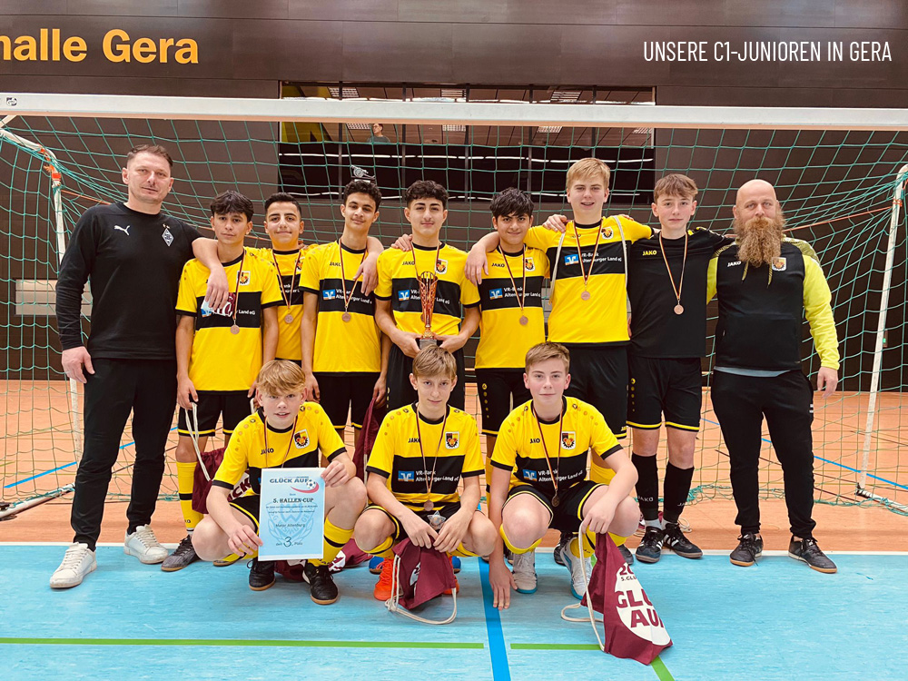 Unsere C-Junioren waren beim 5. "Glück Auf" Hallen-Cup der BSG Wismut Gera zu Gast und belegten am Ende den dritten Platz. Als Gruppenzweiter mit Siegen über Wismut II, Oberweimar und einem Remis gegen Thüringen Jena, war der Weg ins Halbfinale geebnet. Dort verlor man gegen den späteren Turniersieger Wismut Gera n.E. 1:3. Im Spiel um Platz drei zeigte sich unser Team treffsicherer und bezwang Thüringen Weida n.E. mit 3:2.
